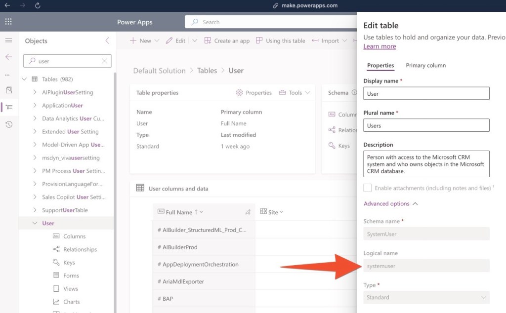 The ‘Users’ table’s logical name is ‘systemuser’, we append and ‘s’ and make it ‘systemusers’, then, in brackets we pass in the GUID of the relevant user, here the ‘Caseworker’ (choose the option with the (Value), this contains the GUID).